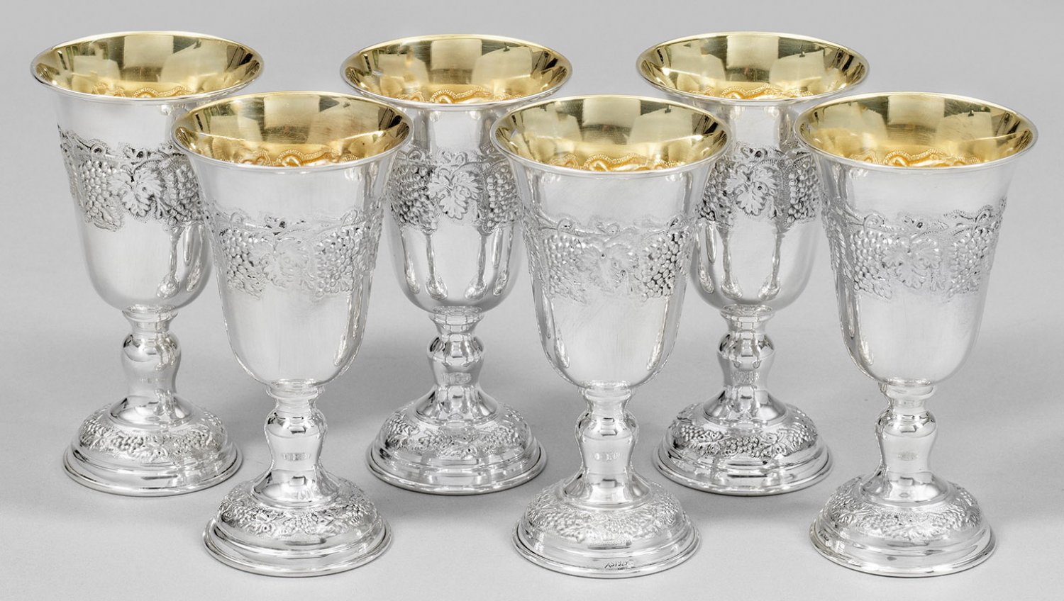 Six Sterling silver wine goblets. Gilt inside. Standard mark 925.