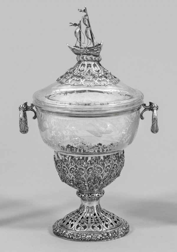 Farbloses Glas mit Silbermontierung. Runder, trompetenförmiger Stand aus reliefierten, durchbrochen gearbeiteten Voluten und Blüten. Darüber glockenförmige Glasschale mit matt geschnittenem Dekor aus detaillierten, fliegenden Vögeln und Blütenfestons. Seitlich zwei bewegliche Ringhenkel. Zur Mitte hin spitz ansteigender Deckel, korrespondierend verziert mit geschnittenem Früchte- und Blütendekor. Bekrönt von vollplastischem Segelschiff auf stilisierten Wellen schwimmend über rosettenförmiger Silbermontierung. Das Schiff dat. "1902/1927". H. 36 cm.