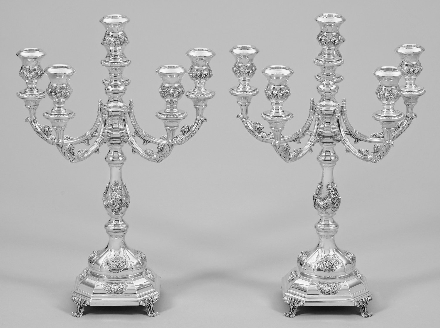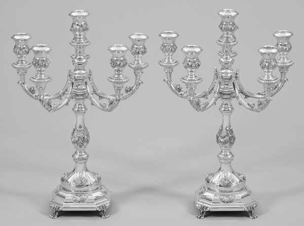 6-flg.; Von Volutenfüßen getragener, achtfach facettierter Stand, beschwert. Hoher, mehrfach gegliederter Balusterschaft mit vasenförmiger Tülle. Unterhalb davon ausgehend fünf volutengeschweifte, godronierte Leuchterarme mit korrespondierenden, kraterförmigen Tüllen. Reicher Reliefdekor aus Blütenfestons, Blättern und Bändern. Gest. 925. Gew. zu. ca. 4000 g. H. 47,5 cm.