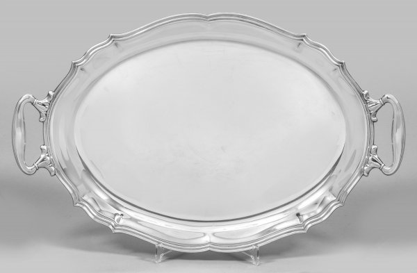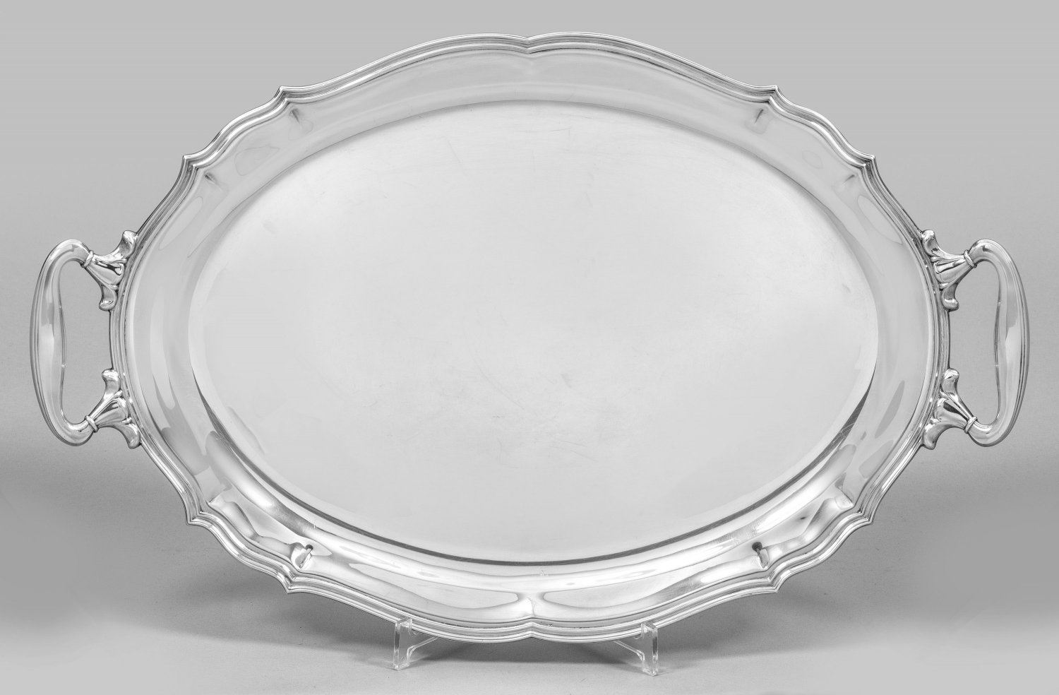 Silber. Oval mit glattem Spiegel. Breite Fahne, übergehend in mehrfach profilierten, passig geschweiften Rand. Seitlich zwei am Ansatz mit stilisierten Blättern verzierte Henkel. Mit minim. Gebrauchsspuren. Gest. 800, Herstellerzeichen. Gew. ca. 1520 g. 85 cm x 36 cm.