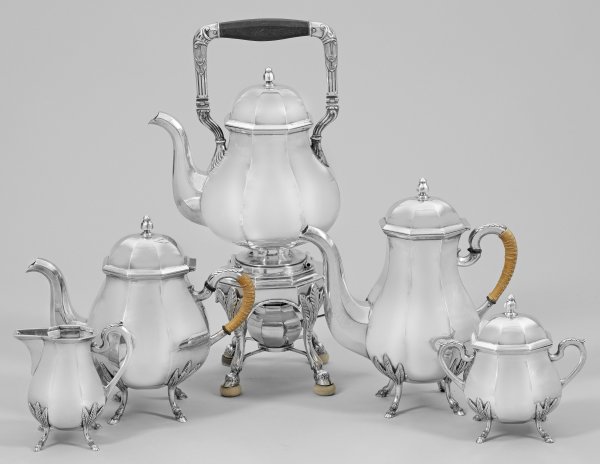 Silber. 5-tlg.; Kaffee- und Teekanne, Wasserkocher mit Rechaud, Sahnegießer sowie Zuckerdose. Vier stilisierte Huffüße mit reliefiertem Blattansatz, übergehend in birnförmigen, achtfach gekanteten Korpus. Tief angesetzter, geschwungener Röhrenausguss. Korrespondierend facettierter, haubenartiger Deckel mit kleinem Balusterknauf. Ohrenhenkel am Ansatz mit Blattverzierung und teilw. geflochtenem Bast umwickelt. Wasserkocher mit übergreifendem, reliefplastisch gestaltetem und gekantetem Bügelhenkel. Handhabe aus Ebenholz. Innen vergoldet. Minim. best.; Gest. 800, Pseudomarken. Gew. zus. ca. 4625 g. H. 13,3 cm-44 cm.