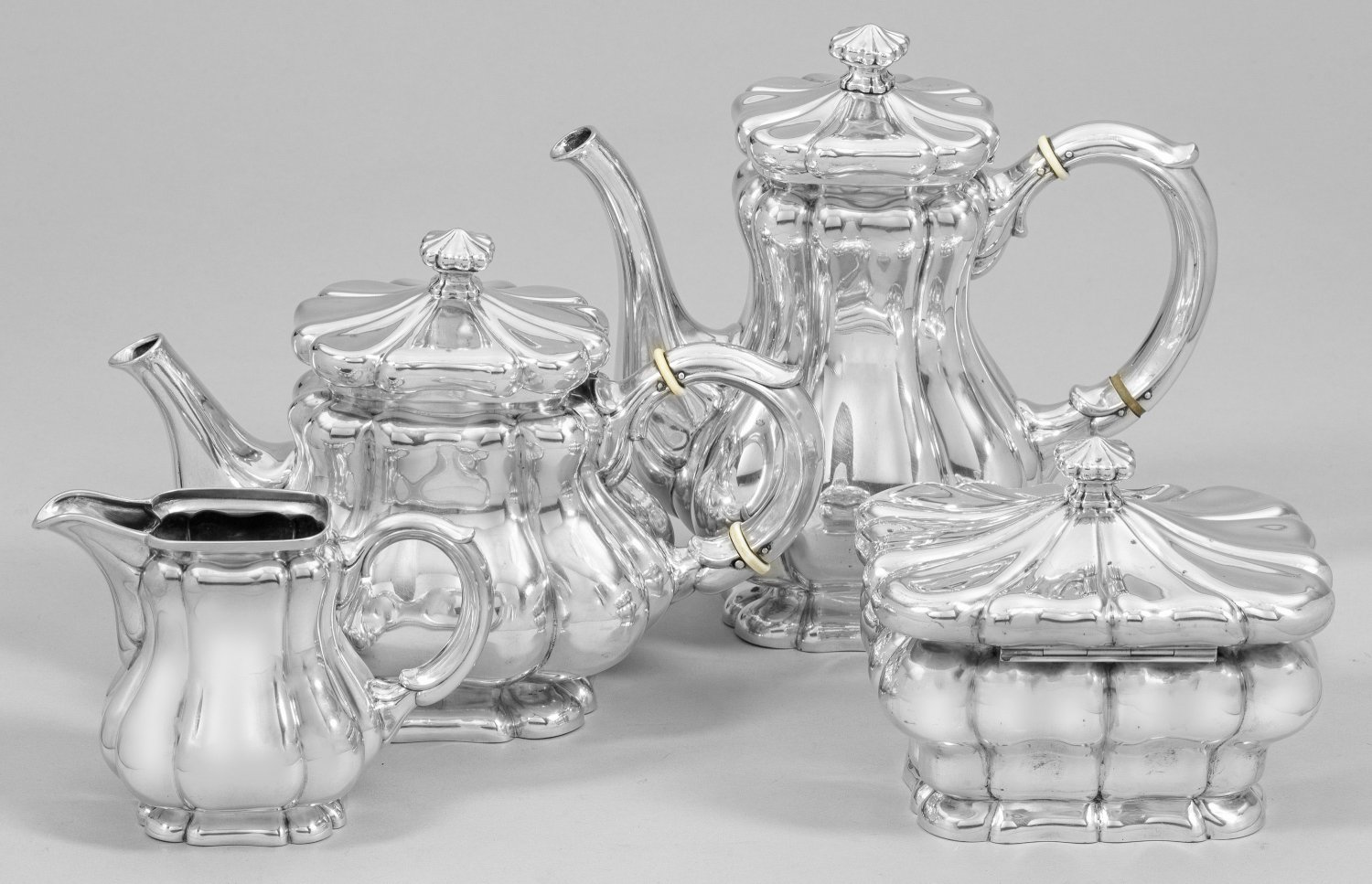4-tlg.; Kaffee-, Teekanne, Sahnegießer und Zuckerdose. Über rechteckig, geschwungenem Stand stark gedrückter, bauchiger Korpus und gewölbter Deckel. Glatte Wandung, umlaufend gegliedert durch vertikal geschweifte, üppige Züge. Tief angesetzter, geschwungener Röhrenausguss. Volutenhenkel und passig geschweifter Knauf. Gest. 800, Herstellerzeichen und Händlermarke W. Lameyer & Sohn. Gew. zus. ca. 2070 g.