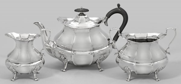 Silber. 3-tlg.; Teekanne, Sahnegießer und Zuckerschale. Ovoide Form. Am Ansatz mit reliefplastischen Blättern verzierte Füße, übergehend in mehrfach facettierten und durch passig geschweifte Züge gegliederten Korpus. Ohrenhenkel und korrespondierender Knauf aus Ebenholz. Tief angesetzter Röhrenausguss. Gest., Herstellerzeichen, Beschauzeichen, Jahresbuchstabe "b". Gew. zus. ca. 1090 g.