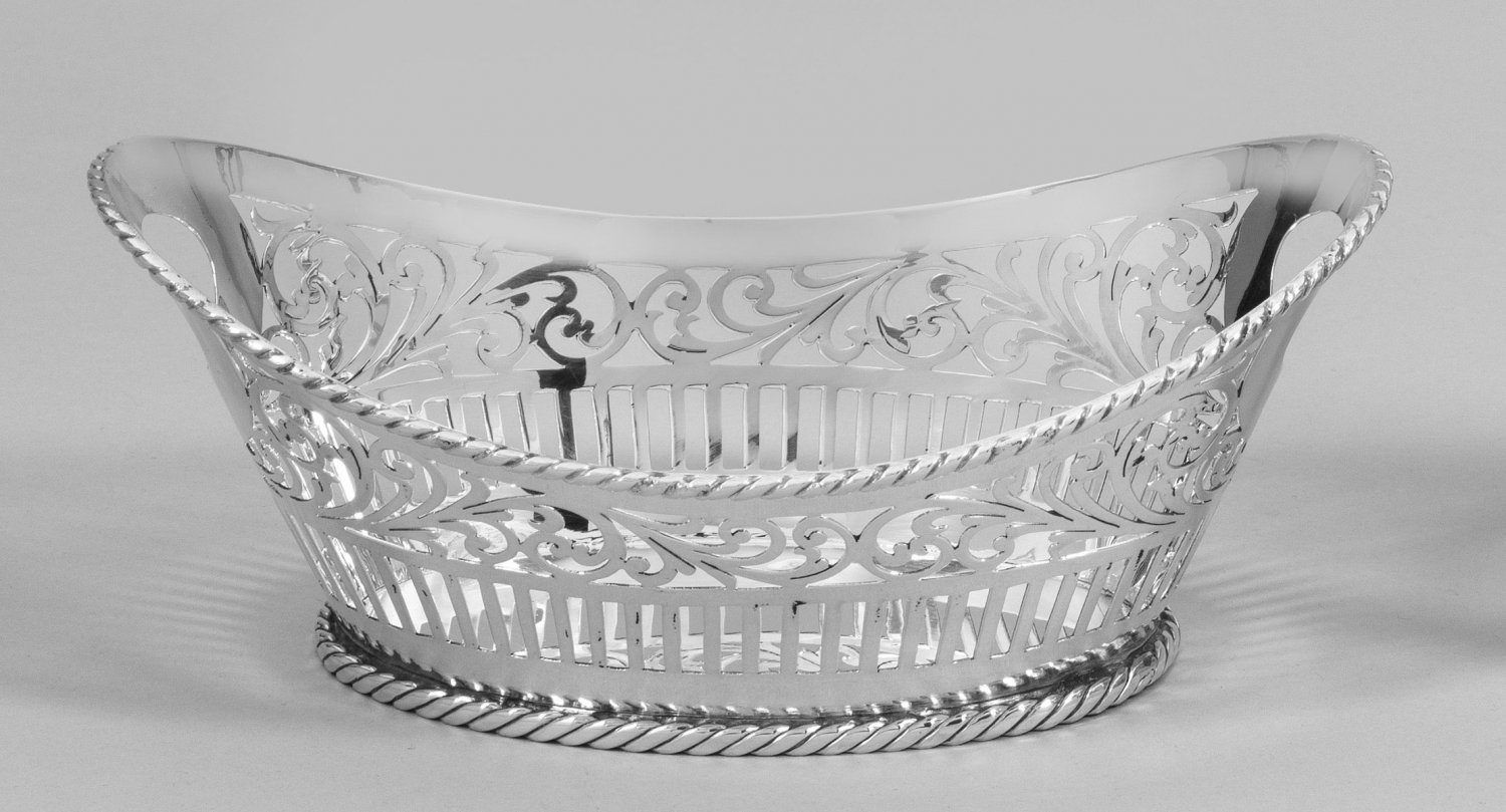 Silber. Über flachem Stand sich konisch erweiternde, floral und stabförmig durchbrochen gearbeitete Wandung mit Griffmulden. Gest. 800. Gew. ca. 330 g. H. 8,5 cm. 22 cm x 14 cm.