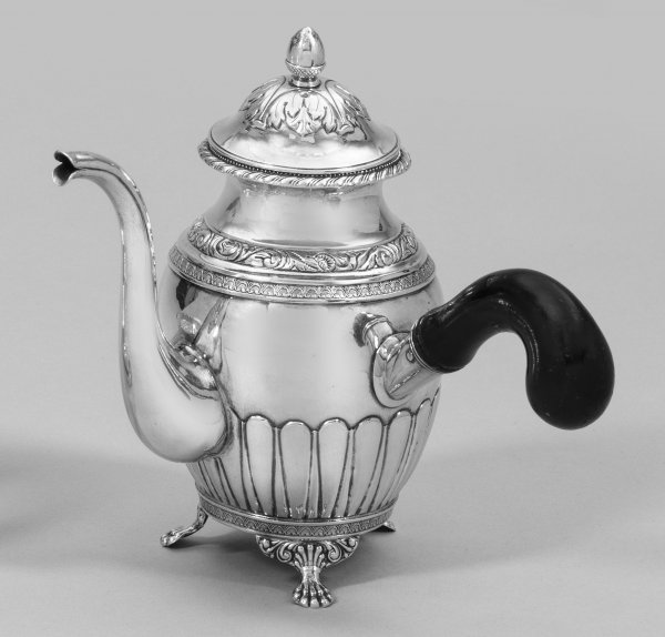 Silber. Ovoider Korpus über drei am Ansatz mit reliefierten Voluten verzierten Tatzenfüßen. Gerundete und durch reliefierte Ornamentbänder mit Voluten und stilisierten Blüten abgesetzte Schulter, übergehend in gekehlten, glatten Hals. Schmaler godronierter Lippenrand. Haubenartig aufgewölbter Deckel, bekrönt von einem Eichelknauf über Akanthusblattrosette. Seitlich gebogter Stielgriff aus ebonisiertem Holz. Gest., verschlagene Stadt-, Meister- und Jahresmarke. Gew. ca. 375 g. H. 18,5 cm.