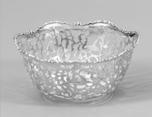 Silber. Über flachem, rundem Stand hoch aufsteigende, durchbrochen gearbeitete Wandung, übergehend in passig geschweiften Perlrand. Gest. 800, Herstellerzeichen, Händlermarke "CL. DAHMEN". Gew. ca. 125 g. H. 6,5 cm. D. 14 cm.