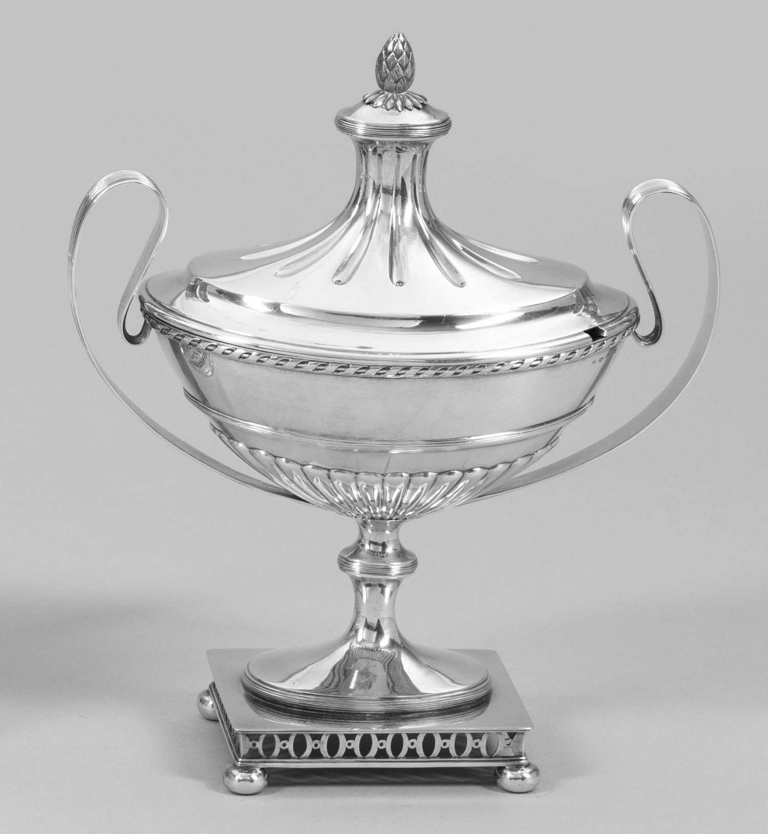 Silber. Über vier gedrückten Kugelfüßen durchbrochen gearbeiteter, rechteckiger Sockel. Darauf ein runder, trompetenförmiger, kurzer Schaft, übergehend in schiffchenförmigen Korpus. Am godronierten Ansatz seitlich zwei hoch aufschwingende, breite Bandhenkel. Der Rand mit umlaufendem Kordelband verziert. Bombiert aufsteigender, kannelierter Deckel. Obenauf plastischer Pinienknauf über Rosette. Gest., Stadtmarke, Jahresmarke "B 7", Meisterzeichen "S P". Gew. ca. 660 g. H. 26 cm.