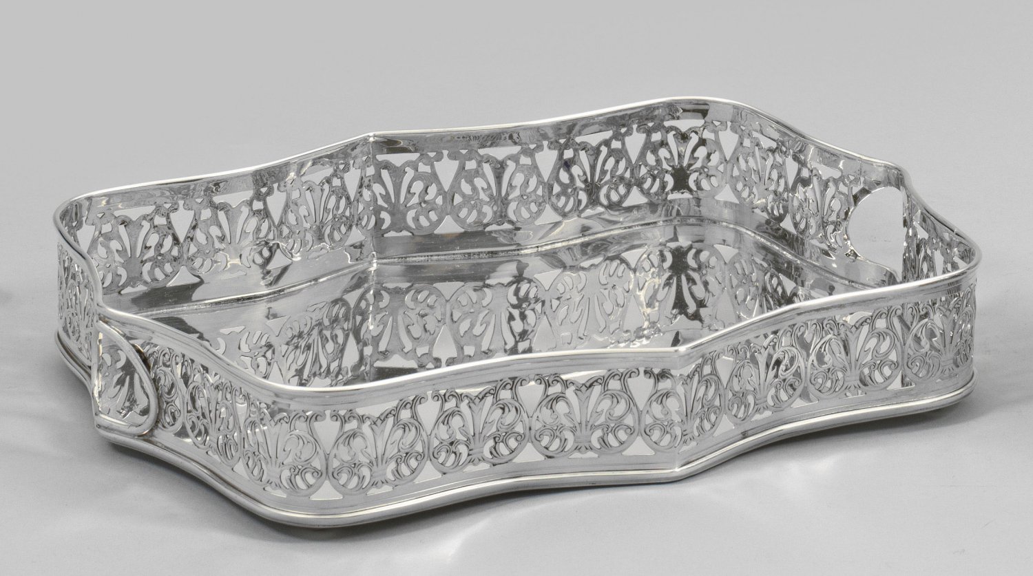 Silber. Passig geschweifte, glatte Bodenplatte, umzogen von volutiert durchbrochen gearbeitetem Rand. An den Schmalseiten kleine Griffmulden. Gest. 925, Herstellerzeichen. Gew. ca. 495 g. 26 cm x 20 cm.