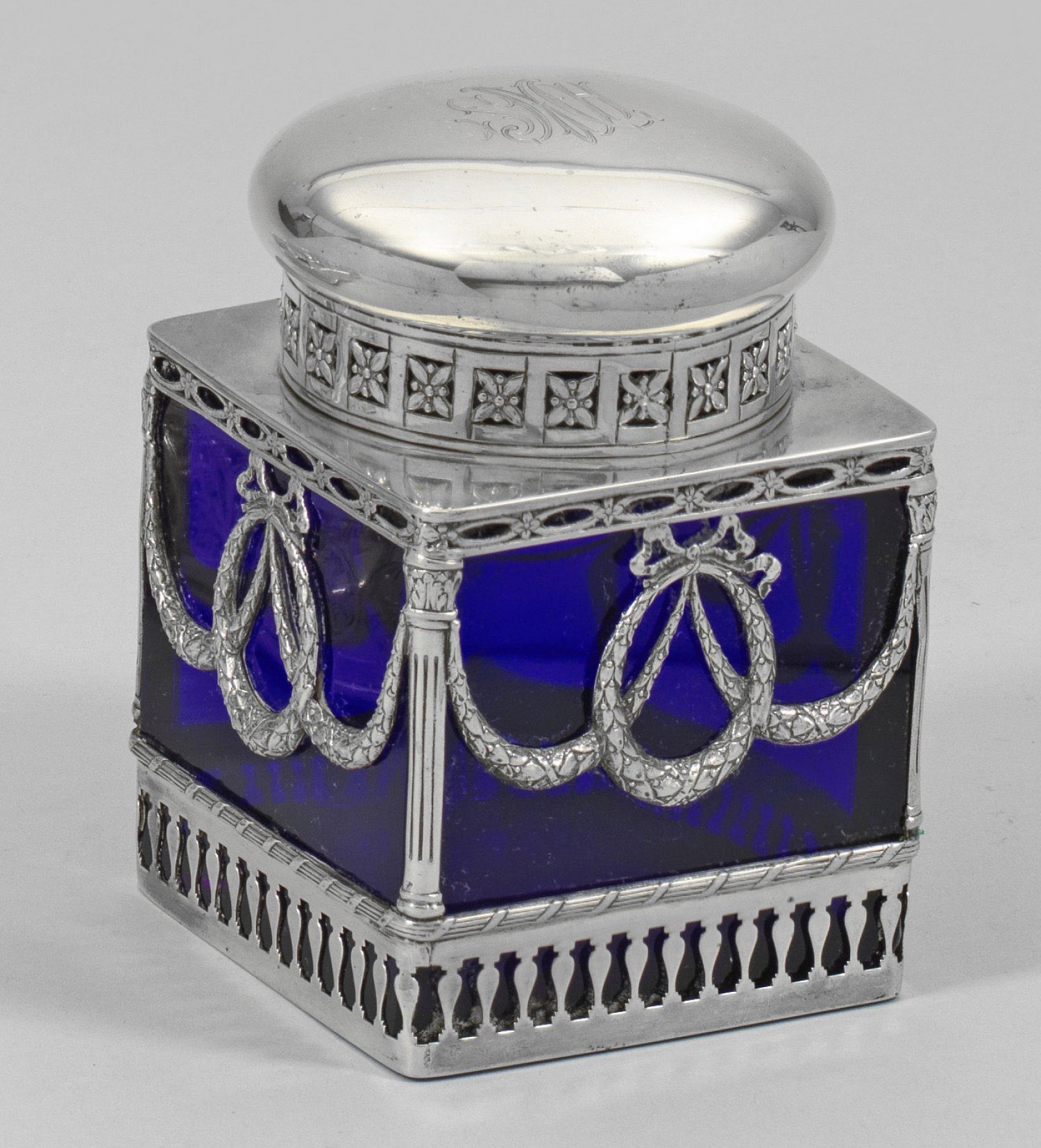 mit Silbermontierung. Würfelförmiger Korpus aus kobaltblauem, geschliffenem Glas. Durchbrochen gearbeitete Montierung aus Schleifen und Blätterfestons. Am Ansatz umzogen von Stabfries und Kordelband. Stulpdeckel aus Silber mit floralem Ornamentband und zentral graviertem Monogramm "S M H" verziert. Innen Glasstöpsel, best.; Gest. 800, Herstellerzeichen. H. 14,5 cm.