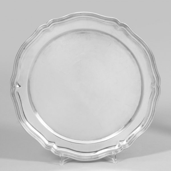 Silber. Rund, in klassischer Chippendaleform. Gering vertiefter, glatter Spiegel, übergehend in breite Fahne. Blütenförmig geschweifter, mehrfach profilierter Rand. Teilw. undeutlich gest., Beschauzeichen, Stadtmarke. Gew. ca. 1080 g. D. 39,5 cm.