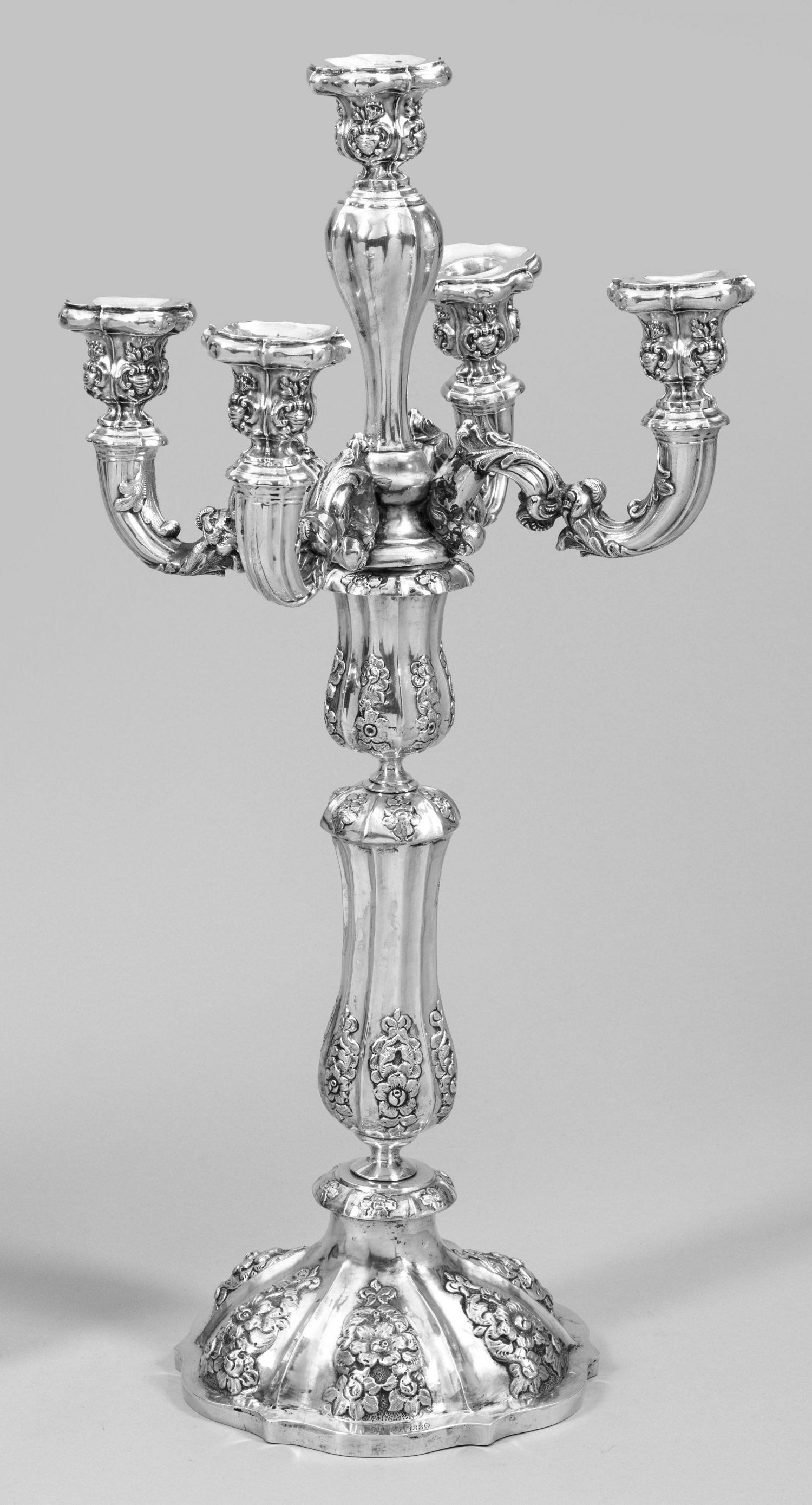 1- bzw. 5-flg.; Silber. Gewölbter, nahezu runder Stand mit passig geschweiftem, ausgestelltem Rand, übergehend in breiten Balusterschaft. Über eingezogener Schulter vasenförmige, große Tülle. Darin einsteckbarer Aufsatz mit vier nach außen gebogten, reich mit Voluten- und Akanthusblatt verzierten Leuchterarmen und zentral verlängertem, konischem Balusterschaft, je in vasenartigen Tüllen endend. Stand und Schaft durch sechs geschweifte Grate und üppig reliefplastischen, buckelähnlichen Blütendekor verziert. Auf Aufsatz und Rand graviertes Besitzermonogramm "H O" sowie dat. "1880". Aufsatz vermutlich ergänzt. Besch. oder rest.; Gest. 84, Beschauzeichen. Gew. ca. 2330 g. H. 59,5 cm.