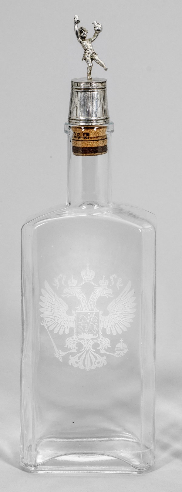 Glas und Silber. Rechteckige Flasche aus farblosem Glas mit abgeflachten Ecken. Schauseitig geätztes Wappen des russischen Kaiserreichs mit Doppelkopfadler und Darstellung des heiligen Georgs als Drachentöter. Obenauf ein figuraler Sturzbecher in Gestalt eines tanzenden und trinkenden Puttos auf einem Fass. Gest. 84. H. 8,5 cm bzw. 28,5 cm.