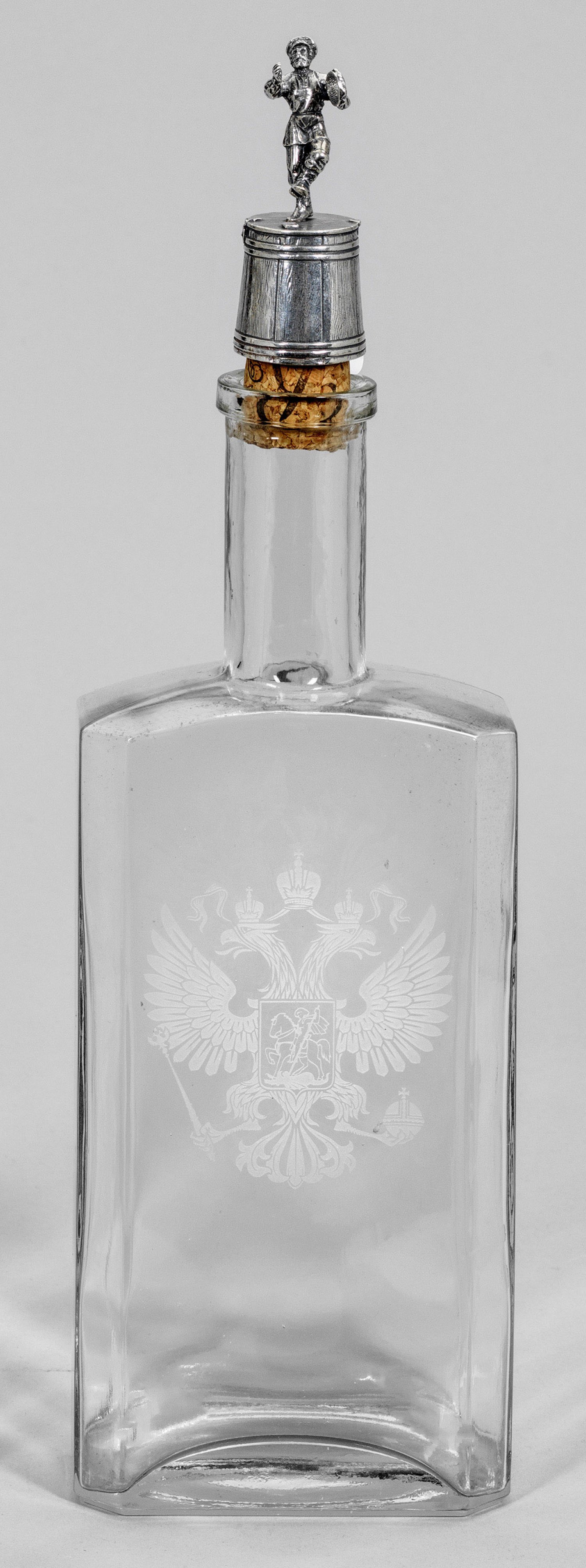 Glas und Silber. Rechteckige Flasche aus farblosem Glas mit abgeflachten Ecken. Schauseitig geätztes Wappen des russischen Kaiserreichs mit Doppelkopfadler und Darstellung des heiligen Georgs als Drachentöter. Obenauf ein figuraler Sturzbecher in Gestalt eines tanzenden Mannes auf einem Fass. Gest. 84. H. 8,5 cm bzw. 29 cm.