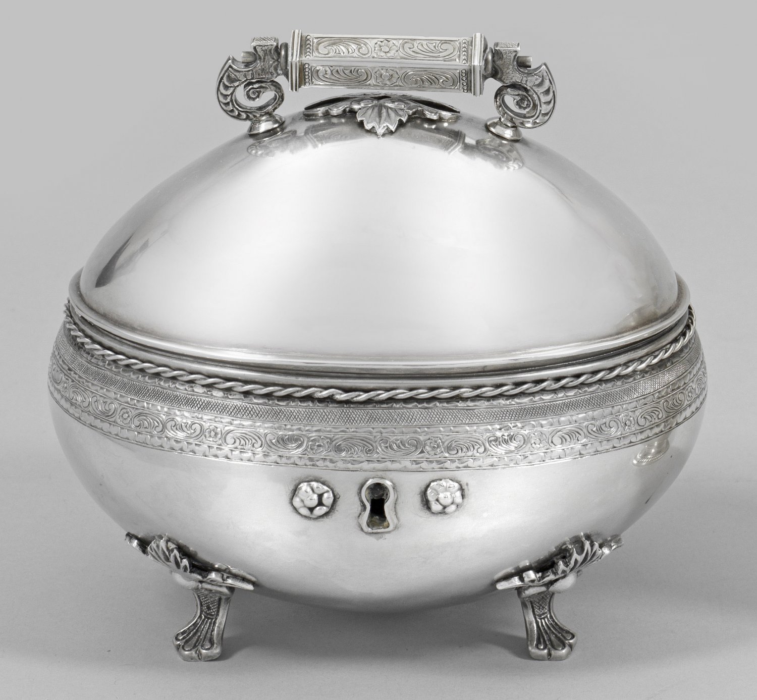 Silber. Ovaler, gedrückt bauchiger Korpus auf vier geschweiften Beinen mit stilisiertem Blattansatz. Glatte Wandung, am Rand umzogen von schmaler Kordel, unterhalb gravierter Volutenfries und Netzdekor. Schauseitig ein von zwei applizierten Blüten gerahmtes Schlüsselloch. Gewölbter Scharnierdeckel mit fünffach gekantetem, fein ziseliertem und von zwei Voluten getragenem Griff. Innen mit feinem Hammerschlagdekor. Gest., Meistermarke "I K" (?). Gew. ca. 440 g. H. 13,5 cm. 15 cm x 11 cm.