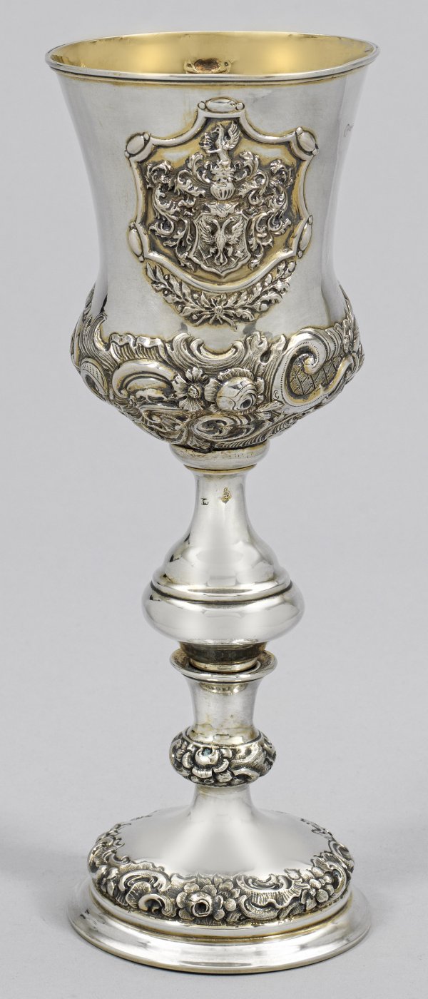 Silber, teilw. vergoldet. Aufgewölbter Stand, übergehend in kurzen, durch großen Nodus unterteilten Balusterschaft. Hohe, am Ansatz gebauchte, sich konisch erweiternde Kuppa. Stand und Kuppa teilw. verziert mit reliefplastischem Blüten-, Rocaillen- und Netzgitterdekor. Auf der Kuppa zwei von Lorbeerzweigen getragene Kartuschen, u. a. mit üppig geschmücktem Habsburger Wappen. Innen vergoldet. Minim. best.; Gest., Beschauzeichen, Meister wohl Christian Sander sen. (wird Meister 1837). Gew. ca. 345 g. H. 27,5 cm.
