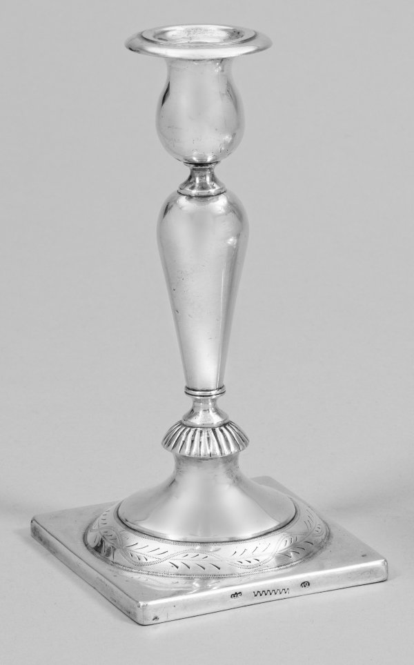 Silber. Über quadratischer Plinthe trompetenförmiger, zart mit stilisierten und punzierten Blattranken verzierter Fuß. Kurzer, am Ansatz godronierter Balusterschaft, übergehend in vasenförmige, gering ausschwingende Tülle und herausnehmbare Traufschale. Gest. 12 Lot, Tremolierstrich, Meistermarke "H S". Minim. altersbedingte Gebrauchsspuren. Gew. ca. 225 g. H. 18 cm.