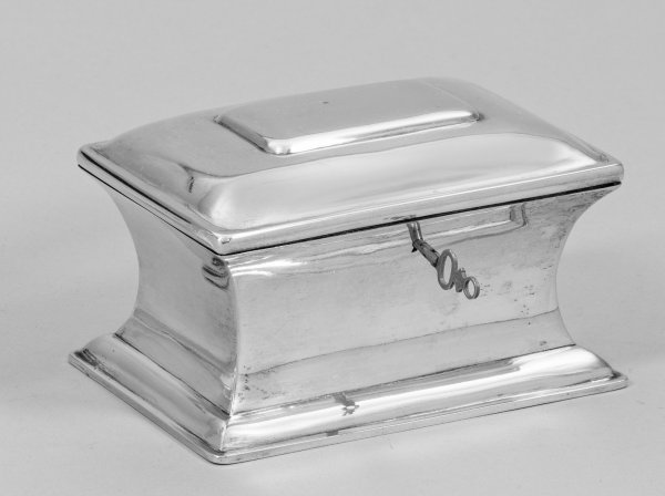 Silber. Rechteckige Form. Leicht aufgewölbter und abgesetzter Stand, übergehend in stark eingezogenen, nach oben hin aufschwingenden Korpus. Gewölbter Scharnierdeckel mit abgesetzter Randzone und abgerundeten Ecken. Mittig erhabenes, rechteckiges Feld. Frontseitig Schlüsselloch mit Schloss. Innen vergoldet. Gest., Meister Ferdinand Kotzmann (tätig um 1840).; Gew. ca. 335 g. H. 8 cm. 13 cm x 8,5 cm.