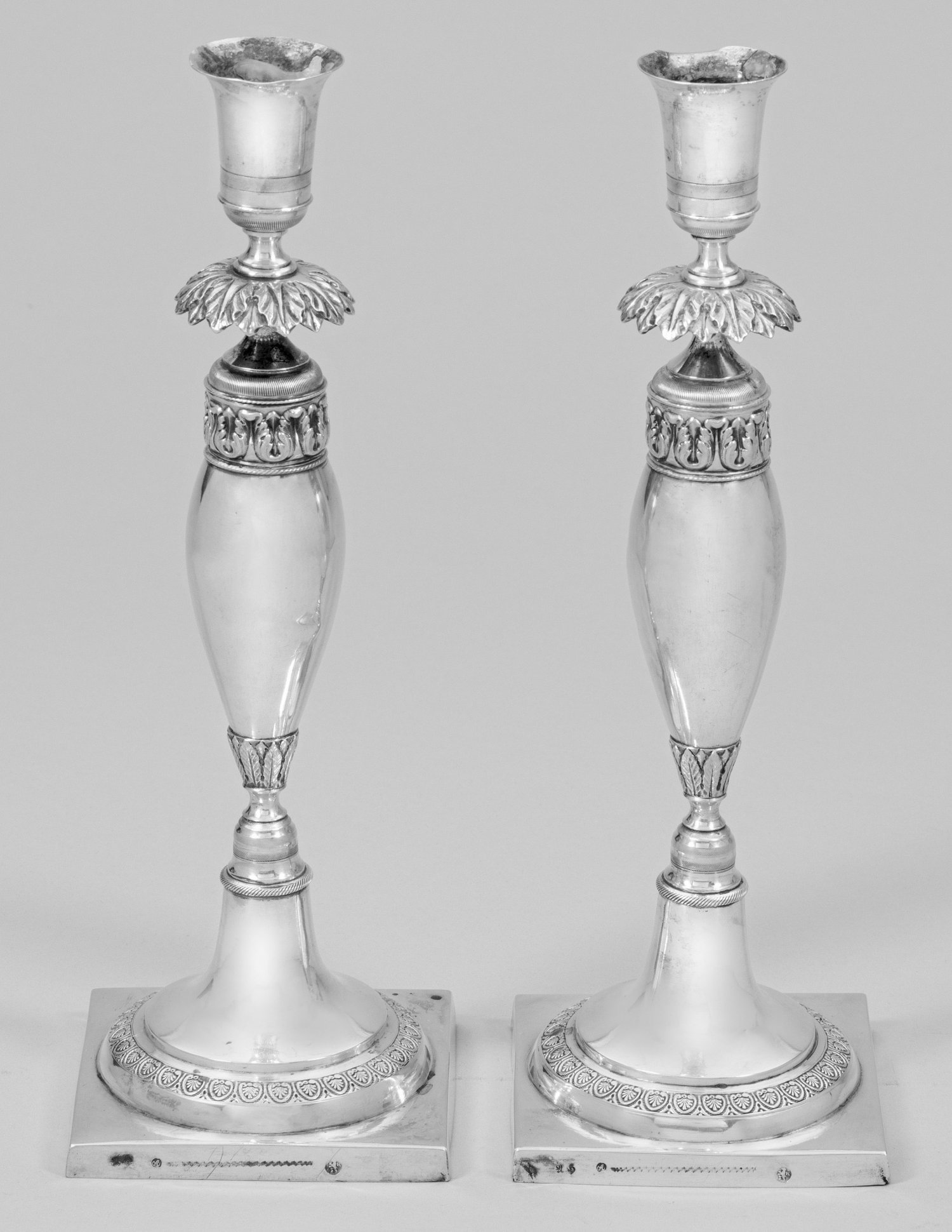 Silber. Auf quadratischer Plinthe trompetenförmig hochgezogener und von reliefiertem Ornamentband gerahmter Rundfuß. Ovoider Balusterschaft von Akanthusblattfriesen gerahmt und in reliefplastisch blattumzogenem Schirmchen endend. Kraterförmige Tüllen. Teilw. best., minim. besch.; Gest.; Tremolierstrich, Beschauzeichen, unbekannte Meistermarke "U B". Gew. zus. ca. 565 g. H. 28,5 cm.