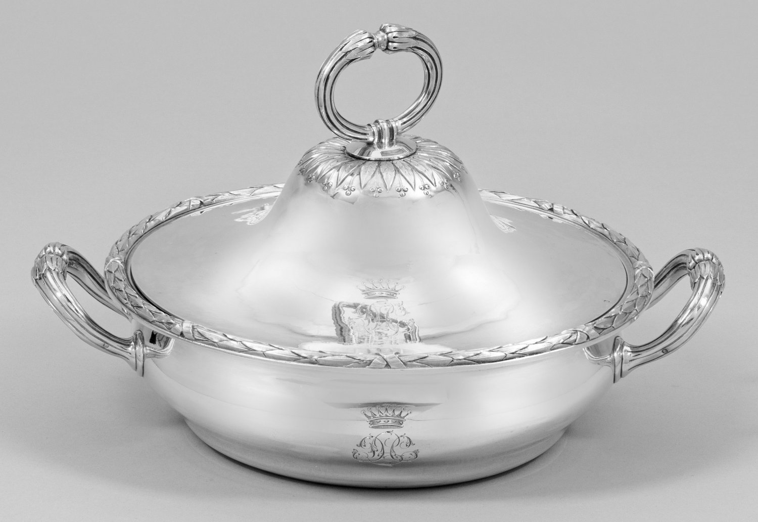 Silber. Runder, flacher Stand, übergehend in bauchig ansteigenden, unterhalb des Randes eingezogenen Korpus. Der ausschwingende Rand mit reliefplastisch gestalteter, umlaufender Lorbeer- und Kreuzbandbordüre verziert. Seitlich zwei konische, in Blätterkranz endende, kannelierte Ringhenkel. Innen herausnehmbarer, runder Einsatz mit zwei schmalen Bandhenkeln. Mittig bombiert aufgewölbter Deckel von fein punzierter Lanzettblattrosette mit zarten Beeren und korrespondierendem Ringhenkel bekrönt. Auf der Wandung der Schüssel, des Einsatzes und dem Deckel ein äußerst filigran graviertes, mit Blattranken verziertes Monogramm unter Freiherrenkrone. Minim. altersbedingte Gebrauchsspuren. Gest., Beschauzeichen, Garantiestempel, Herstellerzeichen. Gew. ca. 1960 g. H. 19 cm. D. 24 cm.
