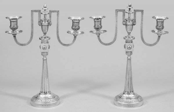 Silber. 2- bzw. 3-flg.; Hoher, runder Stand, mehrfach getreppt und umzogen von reliefiertem Ornamentband, übergehend in konisch verjüngenden, kannelierten Schaft in glattem Kubus, mit applizierten Rosetten endend. Darüber ein Aufsatz, zentral bekrönt von vasenförmiger Tülle mit konisch balustiertem und godroniertem Einsatz. Davon ausgehend zwei kantig geschwungene, schmale Leuchterarme, verziert mit fein reliefiertem Banddekor. Kraterförmig kannelierte, am Ansatz mit Akanthusblattdekor umzogene Tüllen mit je zwei weit ausschwingenden, teilw. herausnehmbaren Traufschalen. Gest. 13 Lot, Beschauzeichen, Meister Johann Gottfried Möhring (wird Meister 1790) sowie sein Sohn Friedrich Wilhelm Möhring (wird Meister 1818). Gew. zus. ca. 2760 g. H. 41,5 cm.