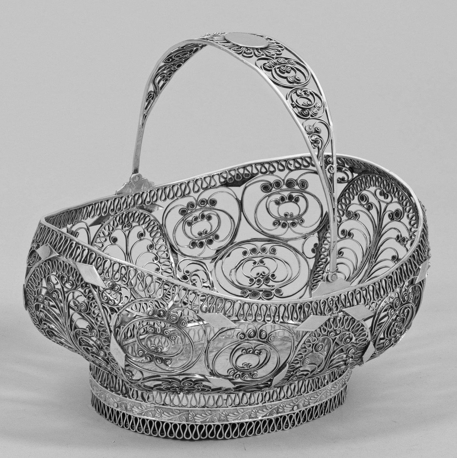 Silber. Über kurzem Stand mit glattem Spiegel ovaler, leicht gebauchter Korpus mit übergreifendem, beweglichem Bandhenkel. Wandung und Henkel umlaufend durchbrochen gearbeitet in feiner, floraler Filigranarbeit. Minim. besch.; Gest. 12 Lot, Meistermarke "F P". Gew. ca. 455 g. H. 13,5 cm. 20 cm x 15,5 cm.