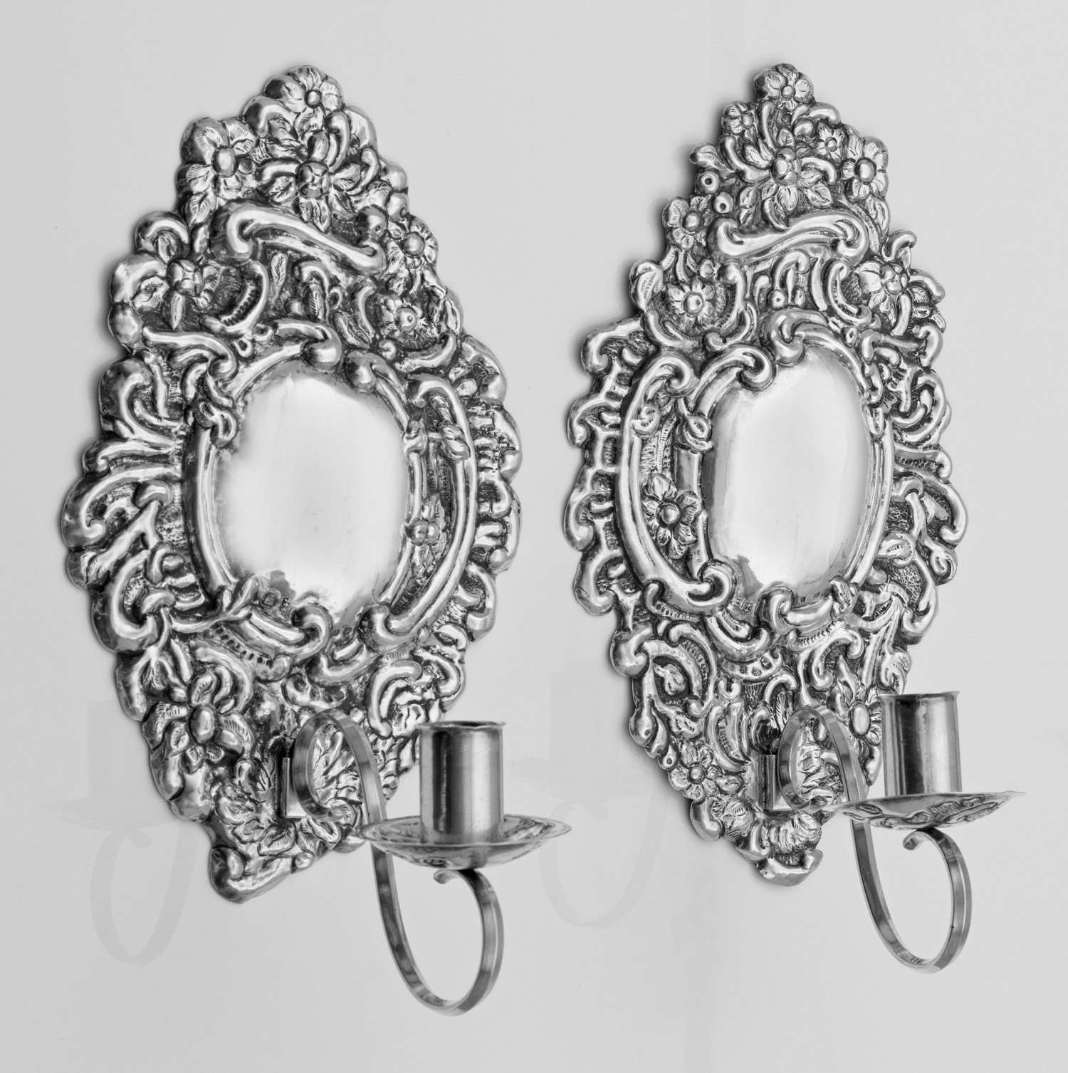 Silber. 1-flg.; Passig geschweiftes, von hochreliefplastischen Rocaillen und Blüten gerahmtes Wandschild mit konvex gewölbtem, ovalem Spiegel. Herausnehmbarer Leuchterarm mit zylindrischer Tülle und leicht gemuldeter Traufschale mit floral reliefiertem Blumendekor. Gest., Beschauzeichen, Beschaumeisterzeichen "E", Meister Emmanuel I Ellerholtz (wird Meister 1758), preußischer Steuerstempel. Gew. zus. ca. 685 g. 29,5 cm x 17 cm.
