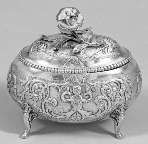 Silber. Ovoider, gebauchter Korpus über vier Beinen, am Ansatz mit reliefierten Rocaillen verziert. Wandung und Deckel umzogen von einer breiten Bordüre aus reliefplastischen Blumen- und Blattranken über punziertem Grund. Großer, plastischer Zweig mit Blüte als Knauf. Der Deckelrand umzogen von Perlband. Innen vergoldet. Gest., Stadtmarke, Jahresbuchstabe "E" oder "F", Meister Johann Carl Hecker (wird Meister 1784). Gew. ca. 575 g. H. 15 cm. 16 cm x 10 cm.