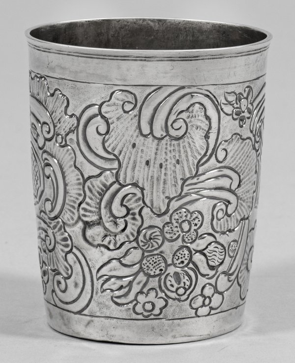 Silber. Gering konisch, mit glatten Wandungsrändern und schmalem Lippenrand. Umlaufend verziert mit getriebenem, reliefplastischem Voluten-, Rocaillen- und Blütendekor. Innen vergoldet. Gest., Stadtmarke, Beschaumeister Iwan Saweljew, Alderman Fedor Petrow, bisher unidentifzierter Meister. Altersgemäße Gebrauchsspuren. Gew. ca. 86 g. H. 7,8 cm.