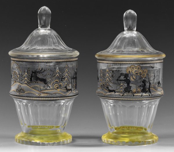 A pair of Bohemian cut and painted glass candy dishes designed by Adolf Beckert manufactured by Glasfachschule and Glasmanufaktur Friedrich Pietsch in Steinschönau (Kamenický Senov).