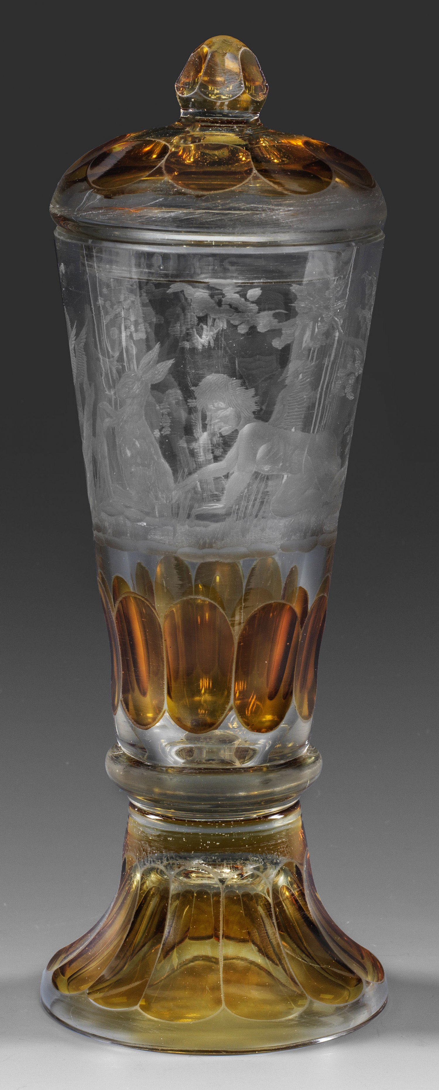 Farbloses Kristallglas, geschliffen, partiell silbergelb gebeizt. Auf Glockenfuß hoher, konischer, becherförmiger Korpus, der Fuß und Kuppaansatz facettiert. Gewölbter Deckel mit eichelförmigem Knauf, in gleichartiger Weise facettiert. Auf der Wandung umlaufender, matt geschnittener Dekor mit szenischem Dekor in Landschaft. H. 26 cm.