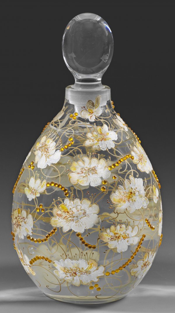 Tropfenform, ovoider Stöpsel. Reicher floraler Dekor in opaler Email- und Reliefgoldmalerei sowie aufgelegte, Juwelen imitierende, perlenartige Applikationen aus goldgelbem Glas. H. 32 cm.