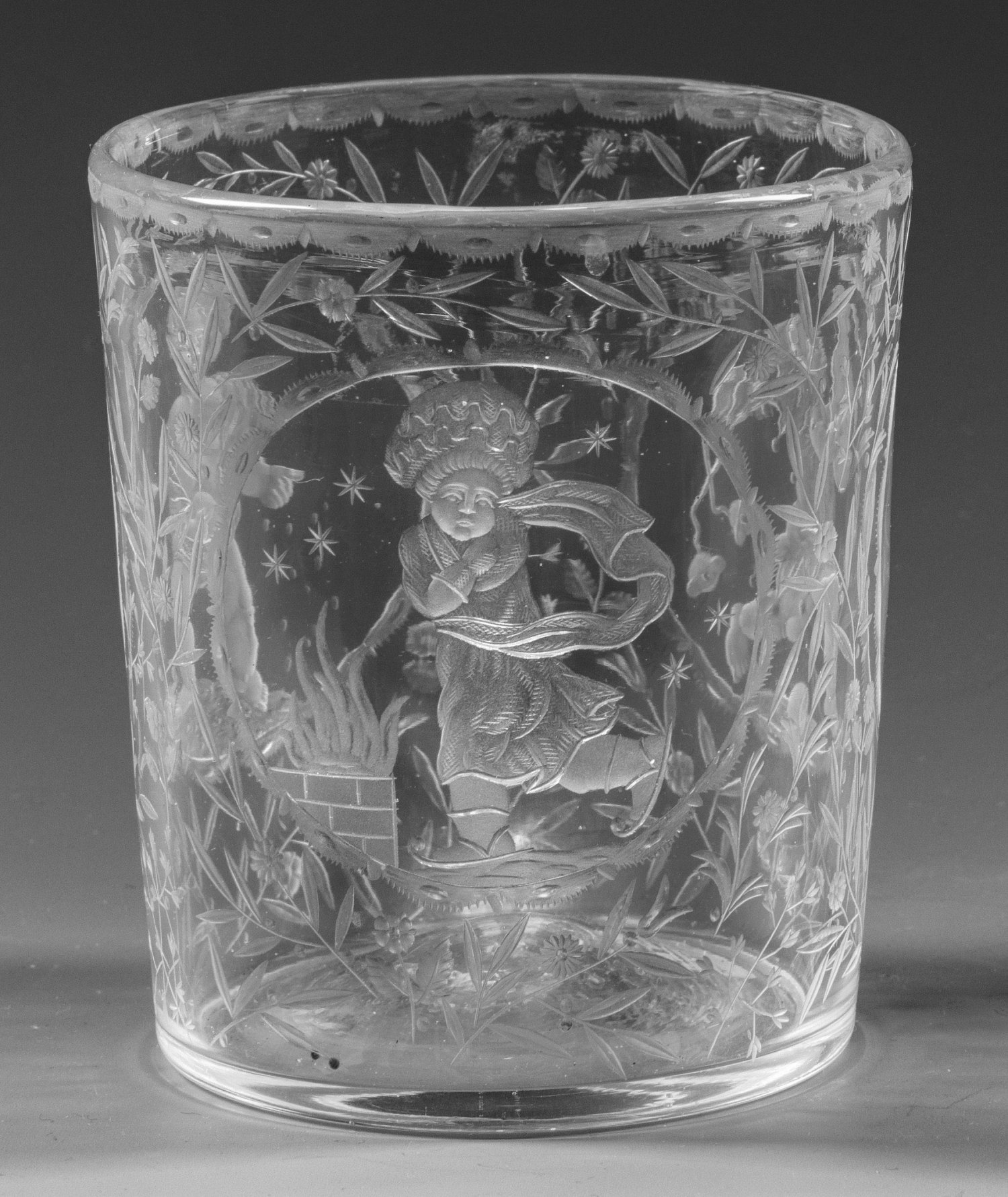 Zylindrisch, hochgestochener Boden mit Abriss. Farbloses Glas. Auf der Wandung äußerst fein geschnittener, teilw. geblänkter Dekor. In drei Rundmedaillons unterschiedliche Putti in allegorischen Szenen, dazwischen Blatt- und Blütenstängel. Entw. Michael Powolny, um 1913/14. H. 9 cm.