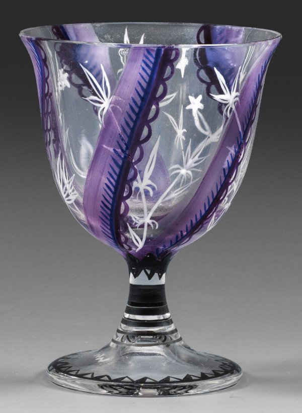 Auf trompetenförmig ausgestelltem Fuß und Schaft glockenförmige Kuppa. Farbloses Glas, geschliffener Rand. Dekor in farbiger, schwarzer und weißer Emailmalerei. Sign. "WW", weiß gemalt. H. 8,8 cm.
