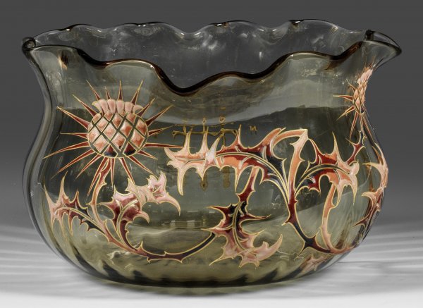Ovale, gebauchte, gedrungene Vase mit weiter Mündung und gewellt gekniffenem Rand. Rauchfarbenes Glas, längsoptisch geblasen. Dekor in farbiger Relief-Emailmalerei und Gold aus einem rankendem Distelstängel und dem Lothringer Kreuz. Sign. "E. Gallé Nancy". H. 12 cm, B. 19,5 cm.