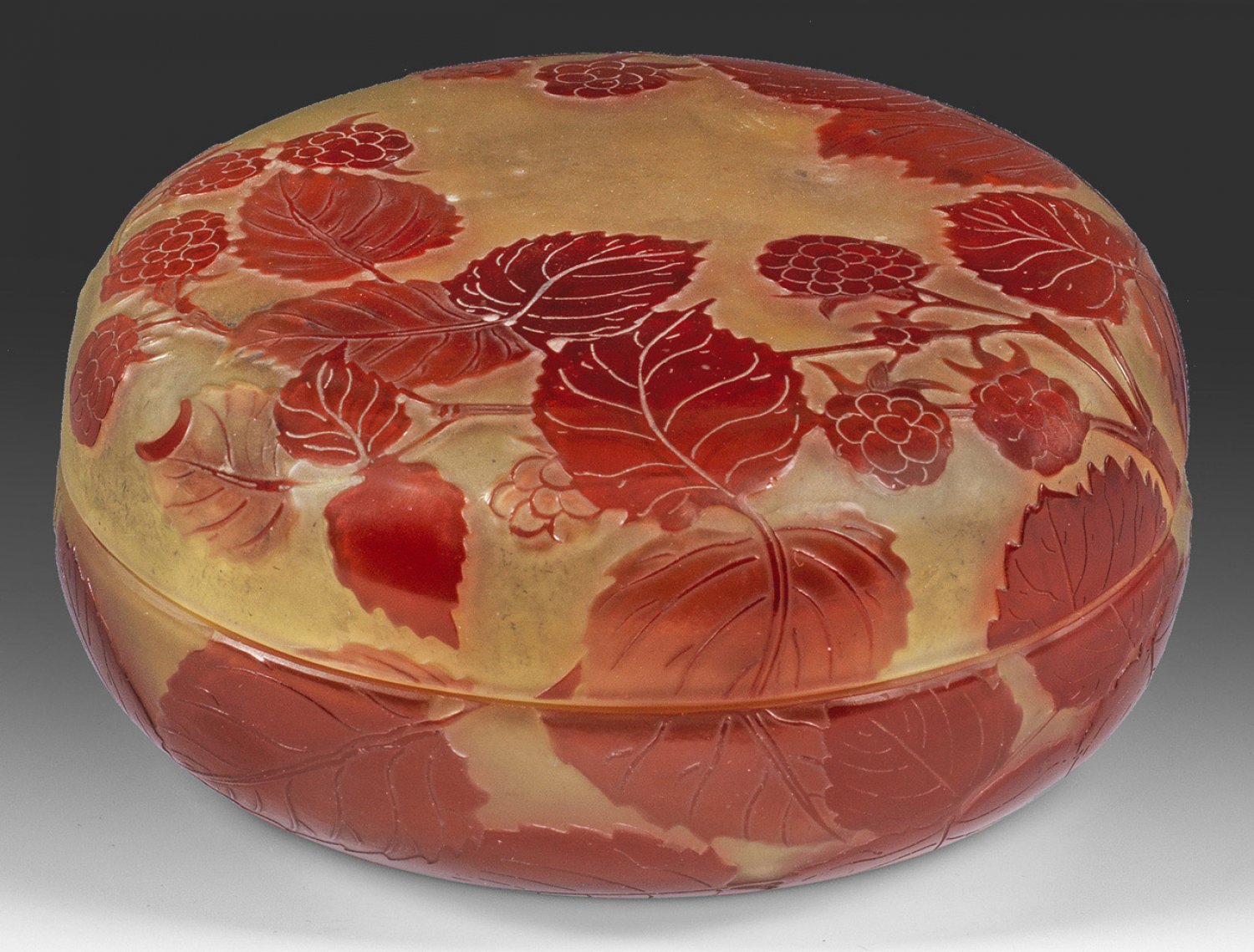 Flache Form, Deckel und Unterteil gleichartig gerundet gestaltet. Überfangglas, farblos, gelb und rot. In mehreren Arbeitsgängen geätzter und polierter Dekor aus Brombeerenranken mit Früchen. Sign. Gallé. H. 6,8 cm; D. 14 cm.