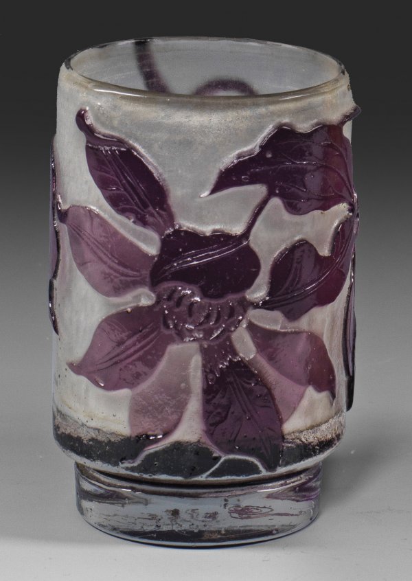 Ins Oval gedrückte Form mit massivem Fuß. Farbloses Glas, violett überfangen. In mehreren Arbeitsgängen ausgeführter, geätzter, außen feuerpolierter Dekor, der Grund und der Rand partiell ausgeschliffen. Sign. "Gallé déposé". H. 8,2 cm.