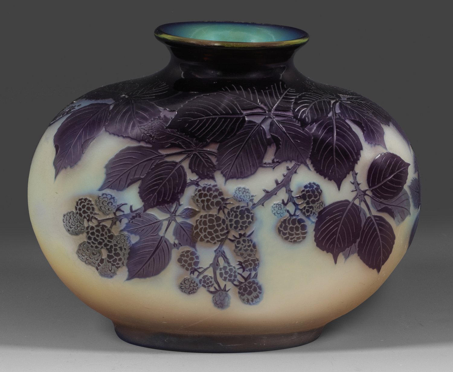 Stark gebauchte, beidseitig angeplattete, ins Oval gedrückte Form. Überfangglas, farblos, cremefarben, hellblau und violett. In mehreren Arbeitsgängen geätzter und polierter Dekor aus Brombeerenranken mit Früchen. Sign. Gallé. H. 14,5 cm.