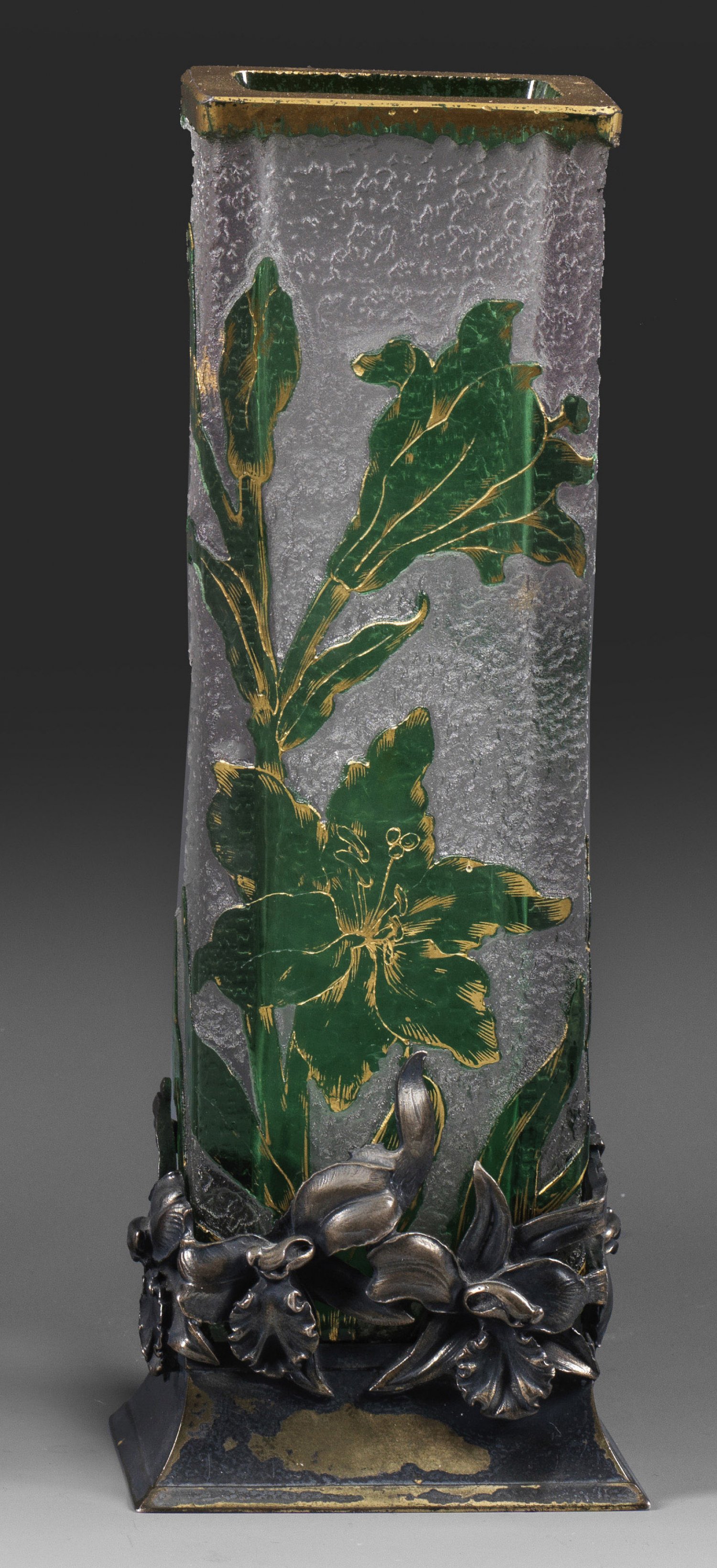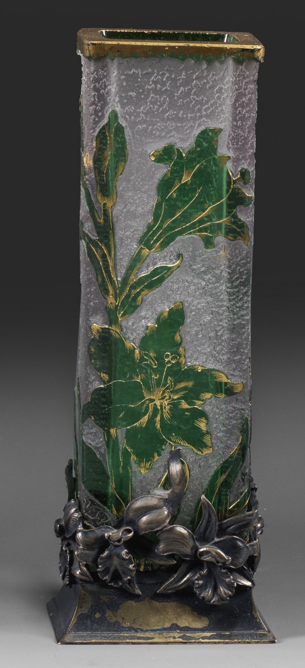 Hohe Stangenform, rechteckiger Querschnitt. Hellviolettes Glas, violett überfangen. Geätzter Dekor mit Goldmalerei, eisglasartiger Grund. Sign. "Daum Nancy" und Lothr. Kreuz in Gold. Einsteckbar in teilw. durchbrochen gearbeiteten Silberfuß mit reliefierten, korrespondierenden Narzissenblüten, gem. 800, Herstellerzeichen. H. 20 cm.