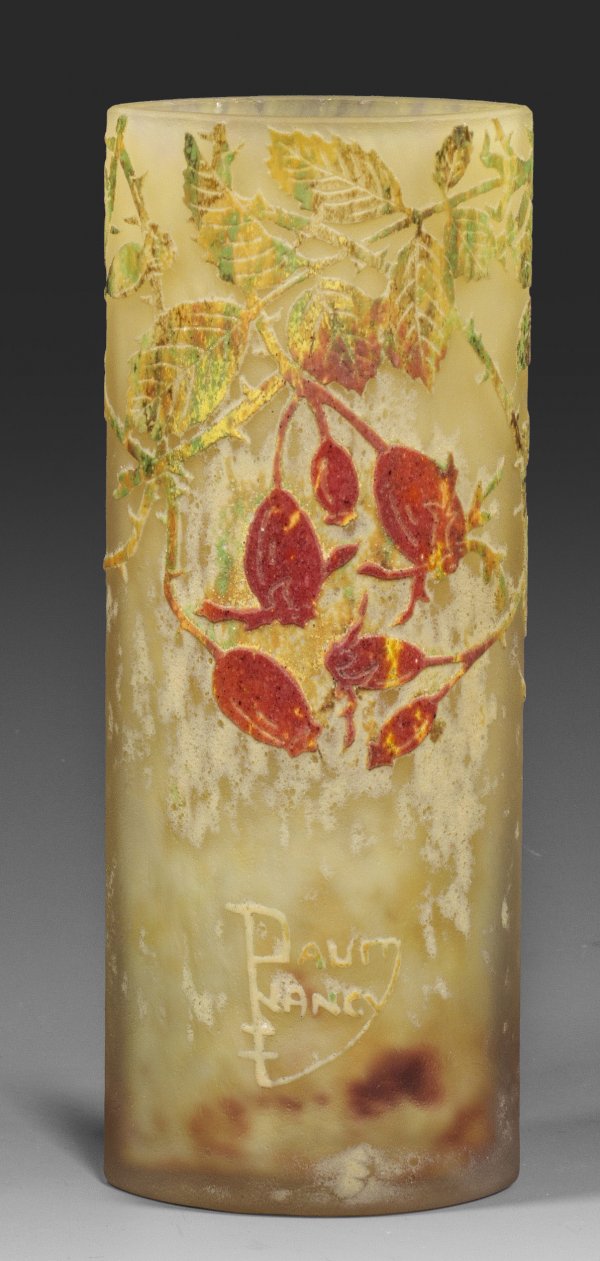 Schlanke Stangenform mit navettenförmigem Querschnitt. Überfangglas, farblos sowie mit polychromen Pulvereinschmelzungen. Umlaufender, in mehreren Arbeitsgängen geätzter Dekor aus Hagebuttenzweigen mit Früchten ("Les Fruits des lŽéglantier"), Binnenzeichnung in Nadelätzung. Entw. Henri Bergé. Sign. Daum Nancy, Lothr. Kreuz. H. 17 cm.