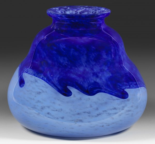 Unterhalb stark gebauchte Birn- bzw. Kürbisform. Überfangglas, farblos bzw. mit hell- und dunkelblauen Pulvereinschmelzungen. Im Boden diamantgeritzte Bez. "Made in France". H. 27 cm.