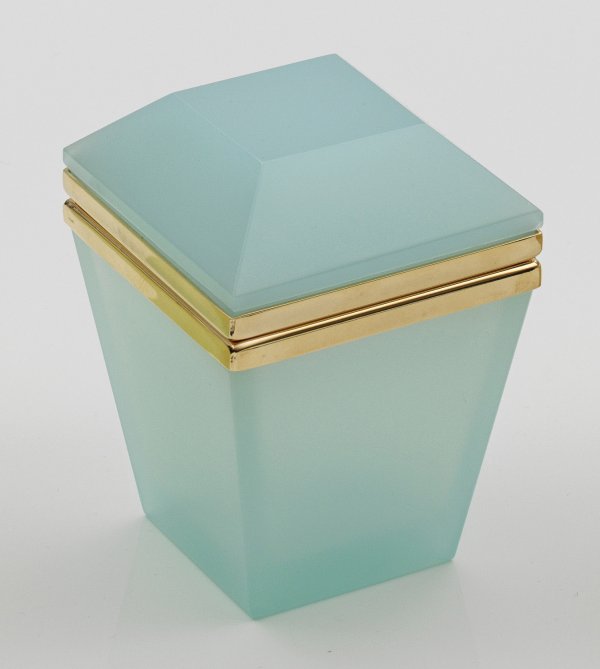 Helltürkisblaues, geschliffenes und poliertes Opalglas. Scharnierte Messingmontierung. H. 11 cm.