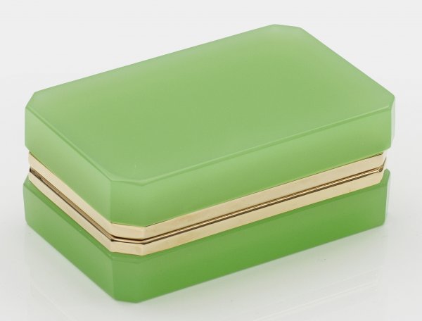 Leuchtend grünes, geschliffenes und poliertes Opalglas. Rechteckige Form mit abgeschrägten Ecken. Scharnierte Messingmontierung. H. 5,5 cm; 13,2 cm x 8,6 cm.