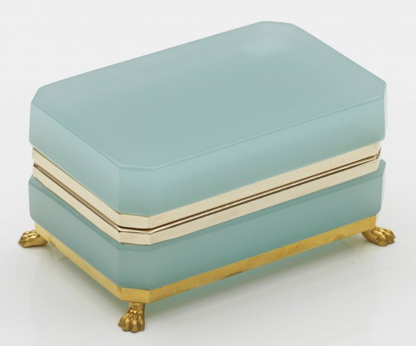 Helltürkisblaues, geschliffenes und poliertes Opalglas. Rechteckige Form mit abgeschrägten Ecken. Scharnierte Messingmontierung, unterhalb vergoldete Montierung mit Tatzenfüßen. H. 7,2 cm; 13,2 cm x 8,5 cm.