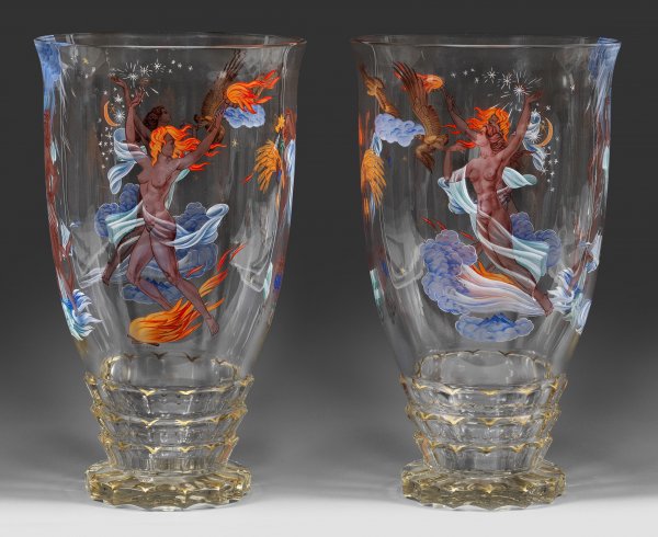 Unikat. Farbloses Kristallglas, geschliffen. Glockenform auf rosettenförmigem Fuß mit geschältem, facettiertem Rand, die untere Wandungszone dreifach abgetreppt mit gleichartigem Schliffdekor. Dekor in polychromer Emailmalerei aus Allegorien der vier Elemente in Gestalt weiblicher Akte mit unterschiedlichen Attributen. Auf der unteren Schliffzone "V"-Bögen in Goldmalerei. Sign. "A PFOHL"; Etikett der Firma J. Blazek, Podebrady (bzw. Haida/Novy Bor), Czechoslovakia (Hersteller des Kristallglases mit Schliff). H. 40 cm.