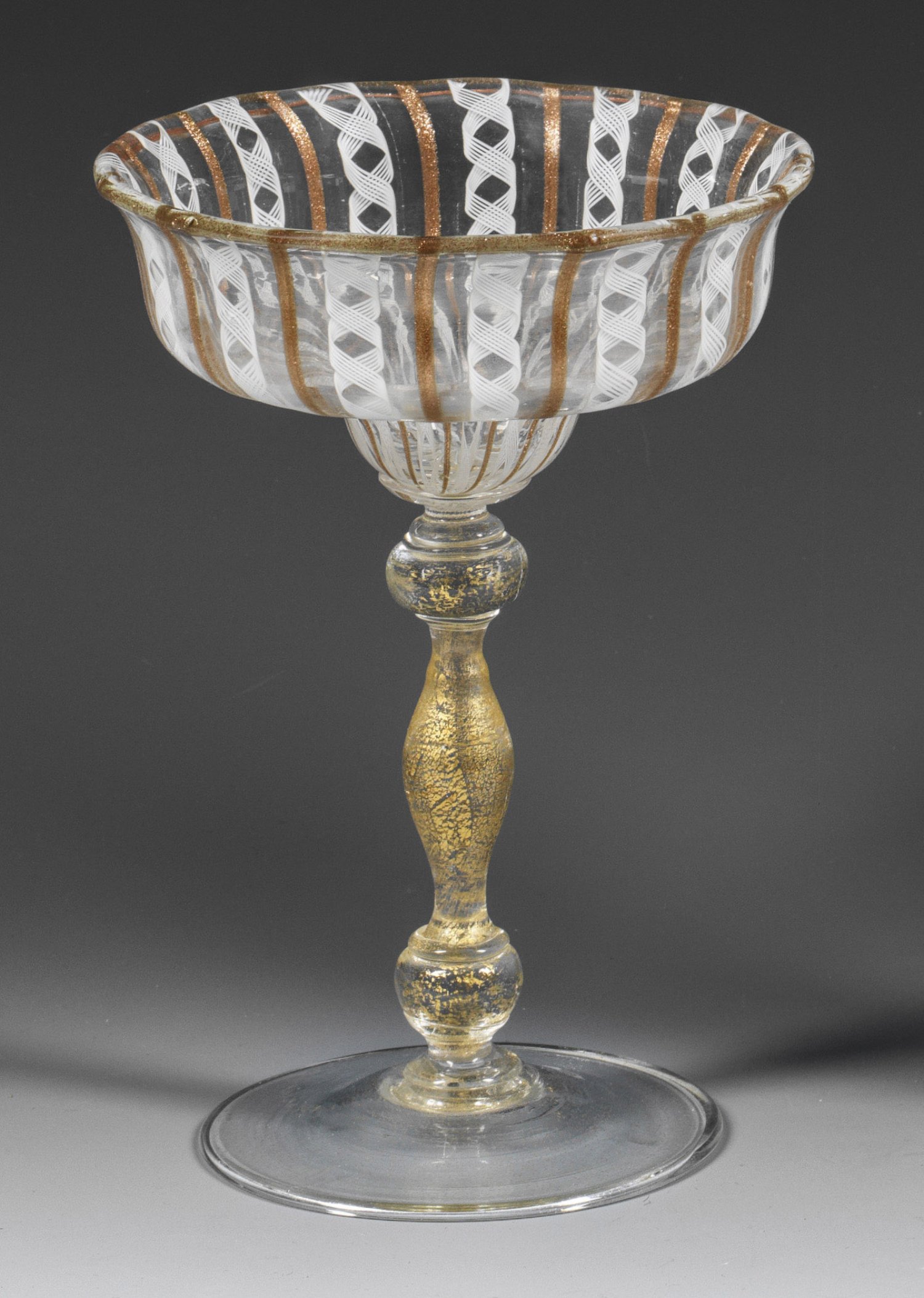 Balusterschaft, weite, glockenförmige Kuppa. Farbloses Glas mit fein zersprengter Goldfolie, die Kuppa mit Aventuringlasfäden und weißem "Filigrana"- bzw. "Zanfirico"-Dekor. H. 16,5 cm.