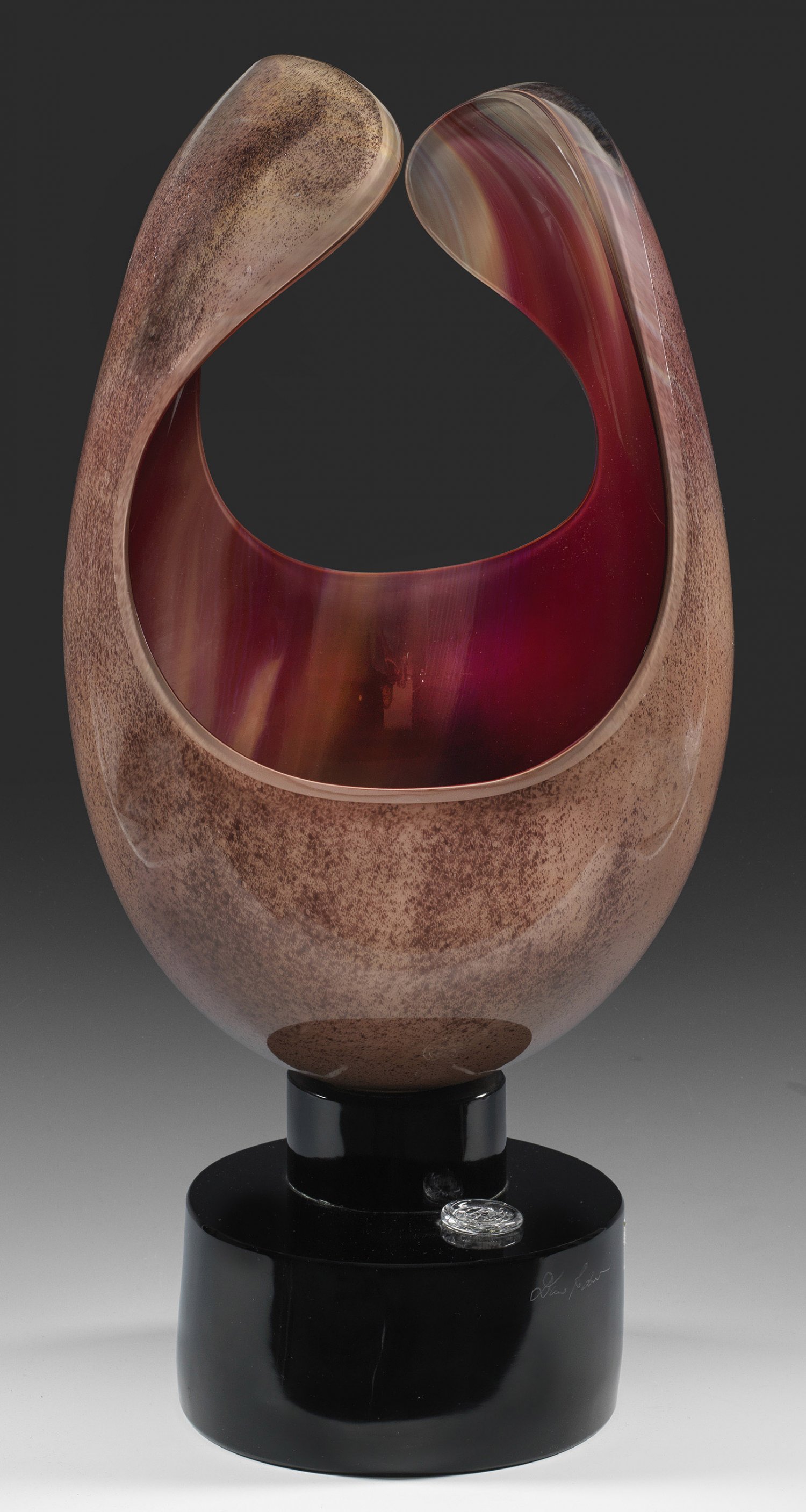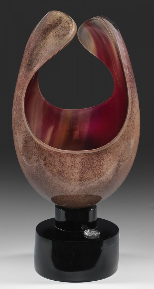 Ovoide, organische, durch asymmetrische Einschnitte gestaltete Form aus Calcedonia-Glas. Schwarzer, abgetreppter Glassockel, zylindrisch bzw. oval und konzentrisch versetzt. Sign. sowie aufgelegte Marke und Studio-Etikett. H, 63,5 cm.