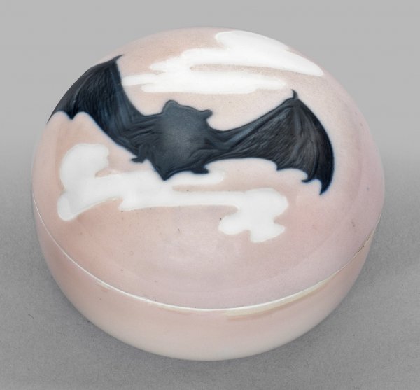 Gedrückte Kugelform. Roséfarbener Fond, teilw. im harmonischen Farbverlauf mit Weiß. Auf dem Deckel die Darstellung einer Fledermaus mit naturalistisch gestalteter Fellzeichnung und weit ausgespannten Flügeln, zwischen weiß ausgesparten, reliefartig konturierten Wolken fliegend. Pastelltonige Unterglasurmalerei in Rosé und Blauschwarz. Form- und Dekor-Entw. Otto Eduard Voigt, um 1906 -1908. Modell-Nr. Y 144. Form-Nr. 150. Minim. Glasurmakel und -fehlstellen. Schwertermarke. H. 6,5 cm. D. 9 cm.