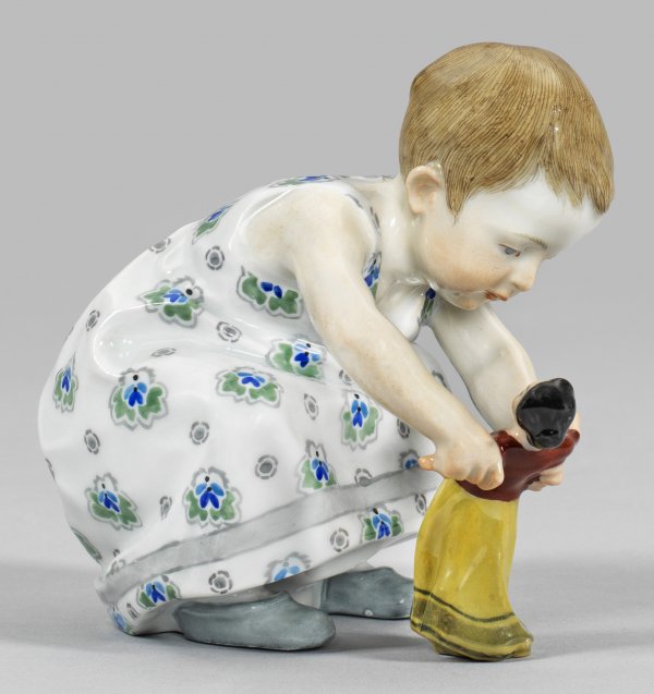 Hockendes, kleines Kind in einem weißen, von blaugrünen Blüten gemusterten Kleid und grauen Pantoffeln, mit einer Puppe spielend. Naturalistische Ausformung. Polychrome Aufglasurmalerei. Entw. Konrad Hentschel, 1904. Modell-Nr. W 117. Schwertermarke. H. 11,5 cm.