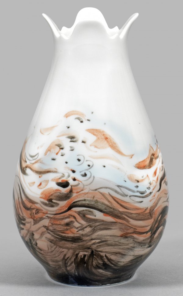 aus limitierter Auflage. Form "Großer Ausschnitt". Auf der unteren Hälfte der Wandung umlaufender, abstahierender Dekor mit wellenartig geschwungenem Pinselduktus. Polychrome. lasierender Unterglasurmalerei. Form-Entw. Ludwig Zepner. Dekor-Entw. Heinz Werner. Im Boden Maler-Monogr. mit Dat. "HW (19)85". Limitierte Auflg., Unikat-Nr. 43/86. Schwertermarke. H. 17 cm.