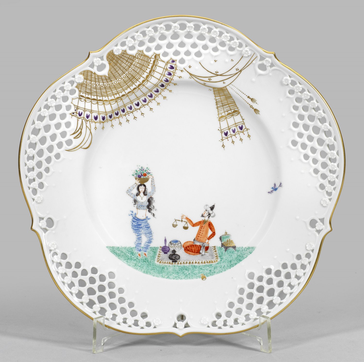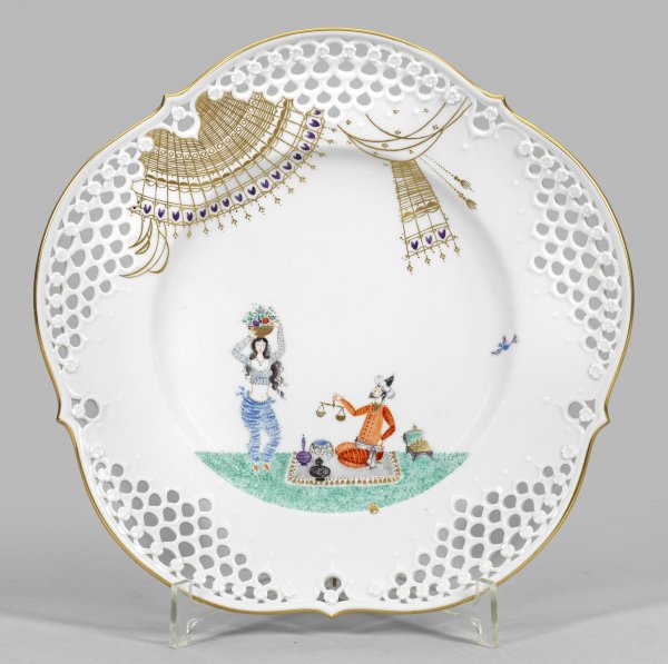 Form "Großer Ausschnitt". Rund mit passig geschweiftem Rand. Durchbrochen gearbeitete Fahne, partiell mit aufgelegten, kleinen Blüten akzentuiert. Im leicht vertieften Spiegel szenische Darstellung aus "1001 Nacht". Form-Entw. Ludwig Zepner. Dekor-Entw. Prof. Heinz Werner. Jahreszeichen. Schwertermarke. D. 28 cm.